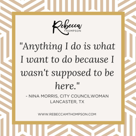 [smart_track_player url=”http://traffic.libsyn.com/changingthefaceofpower/Nina_Morris.mp3″ title=”CFP 002: Nina Morris – City Councilwoman, Lancaster, TX” artist=”Rebecca Thompson ” image=”https://www.rebeccamthompson.com///wp-content/uploads/2016/08/nina-e1470606304445.png” social=”true” social_twitter=”true” social_facebook=”true” ]
